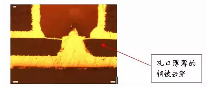 目前在行業(yè)通行的標(biāo)準(zhǔn)(IPC-650)里面,似乎還沒(méi)有給出對(duì)于樹(shù)脂塞孔的孔上面銅厚的要求,潛在的風(fēng)險(xiǎn)是,一旦樹(shù)脂塞孔的孔上面電鍍的銅厚偏薄,經(jīng)過(guò)內(nèi)層HDI線路的表面處理,棕化處理以后,孔口上面的薄薄的銅會(huì)有被激光鉆孔鉆穿的可能,而且在電測(cè)試時(shí)是無(wú)法判定其有問(wèn)題的。但這層薄薄的銅在耐高壓等方面的品質(zhì)著實(shí)讓人擔(dān)憂。