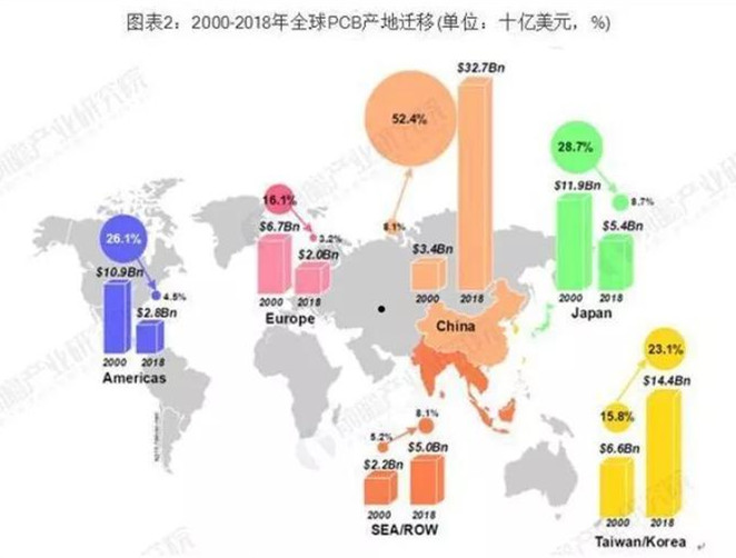 中國作為全球PCB行業(yè)的最大生產(chǎn)國,占全球PCB行業(yè)總產(chǎn)值的比例已由2000年的8.1%上升至2018年的52.4%,美洲、歐洲和日本的產(chǎn)值占比大幅下滑,中國大陸和亞洲其他地區(qū)(主要是韓國、中國臺灣和東南亞)等地PCB行業(yè)發(fā)展較快。