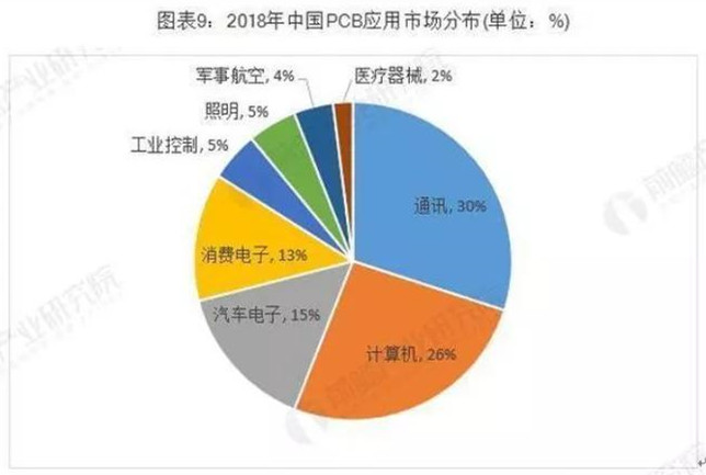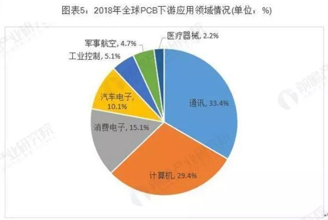 電子信息產(chǎn)業(yè)的蓬勃發(fā)展是PCB行業(yè)發(fā)展的重要助力。從下游應用領(lǐng)域分布來看,2018年通訊行業(yè)的PCB市場規(guī)模最大,占比約為33.4%;其次是計算機行業(yè),占比約為29.4%。其他領(lǐng)域PCB市場規(guī)模較大的是消費電子、汽車電子。
