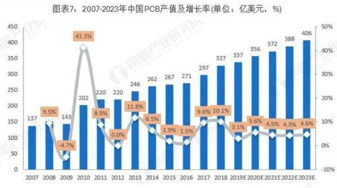 在當前全球經(jīng)濟復蘇的大環(huán)境下,通訊電子行業(yè)、消費電子行業(yè)需求相對穩(wěn)定,同時汽車電子、醫(yī)療器械等下游市場的新增需求逐年上升。根據(jù)Prismark預測,未來五年全球PCB行業(yè)產(chǎn)值將持續(xù)穩(wěn)定增長,預計2018年至2023年復合增長率為3.7%,2023年全球PCB行業(yè)產(chǎn)值將達到747.56億美元。